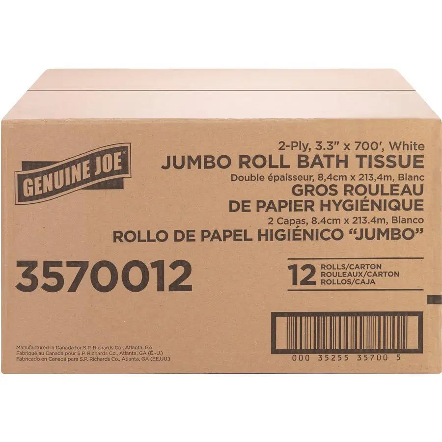 This jumbo roll of two-ply bathroom tissue satisfies everyday needs. Made from a high percentage of recycled fiber, it exceeds EPA comprehensive procurement guidelines. This bathroom tissue is cost-effective solution for all areas and is safe for sewer and septic system. It fits in bathroom tissue dispensers that hold a 12″ diameter roll.
